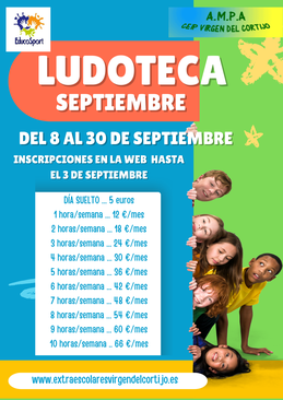 Durante el mes de Septiembre el horario de cole será solo por la mañana, es por ello por lo que para facilitar la conciliación del 8 al 30 de SEPTIEMBRE estará disponible la LUDOTECA en servicio de tarde con dos horarios